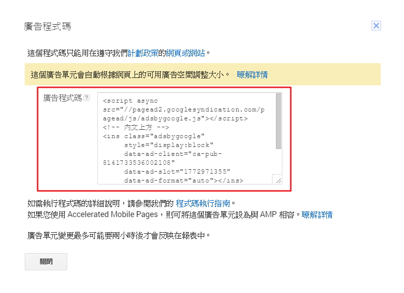 接著就會跳出廣告程式碼,在程式碼上方選擇「非同步」