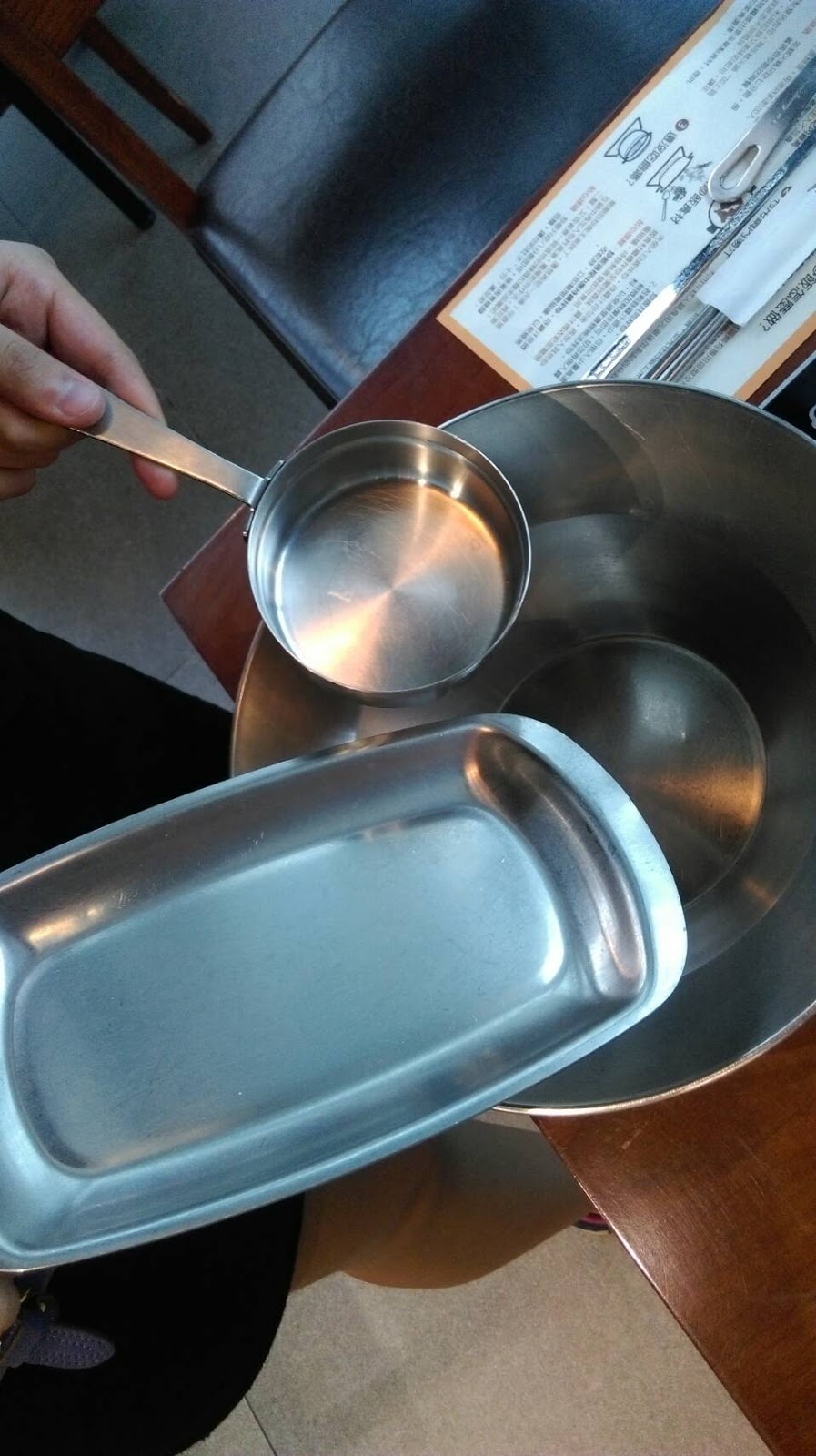 下圖左邊試盛料工具,小勺子是裝醬料、大鍋是裝火鍋料、盤子是裝炸物