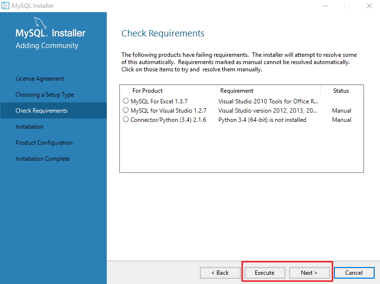 接著這裡有「Excute」可以額外安裝與Visual Studio資料庫做連接