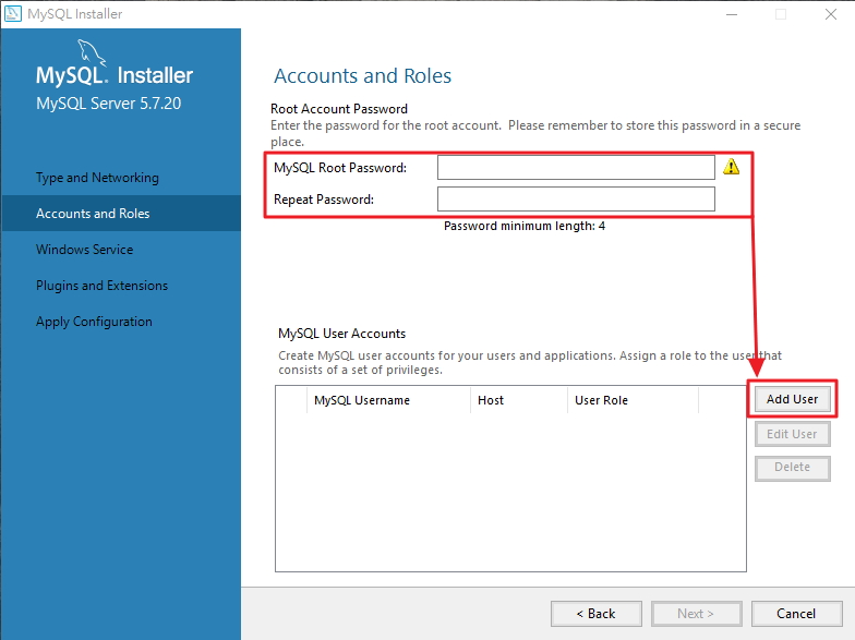 輸入自己的密碼,盡量不要設得太簡單,設定完就點「Add User」