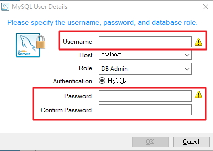 會跳出小視窗,輸入自己想要的使用者名稱跟密碼,Host選擇「localhost」