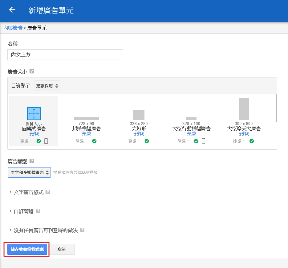 廣告類型建議選擇「文字和多媒體廣告」,接著就可以點「儲存」