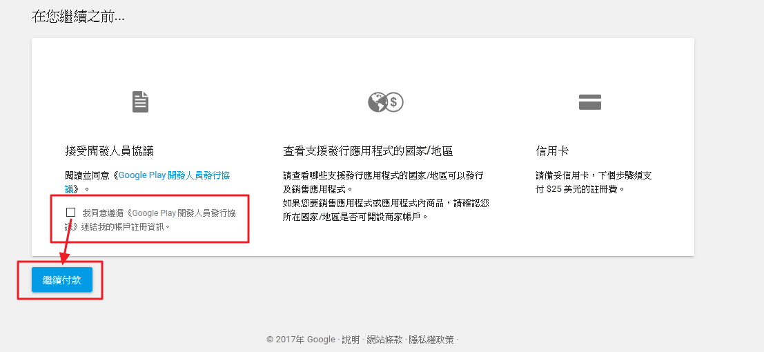 接著將頁面往下滑,勾選同意開發相關資訊後點選「繼續付款」