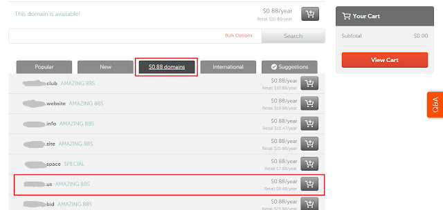 最特別的是有一欄是0.88美元的域名部分,意思就是第一年只要0.88美元,相當便宜