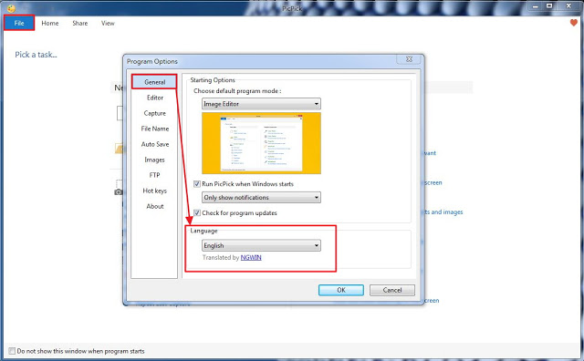 點選左上角的「File」–>「Program Options」–>「General」–>「Language」