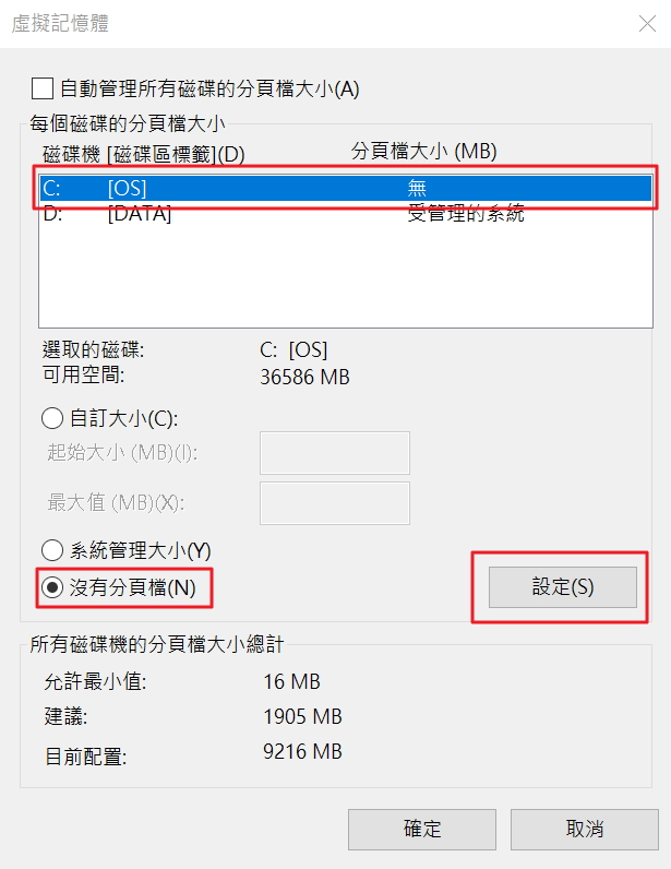 點選C槽 –> 「沒有分頁檔」–>「設定」