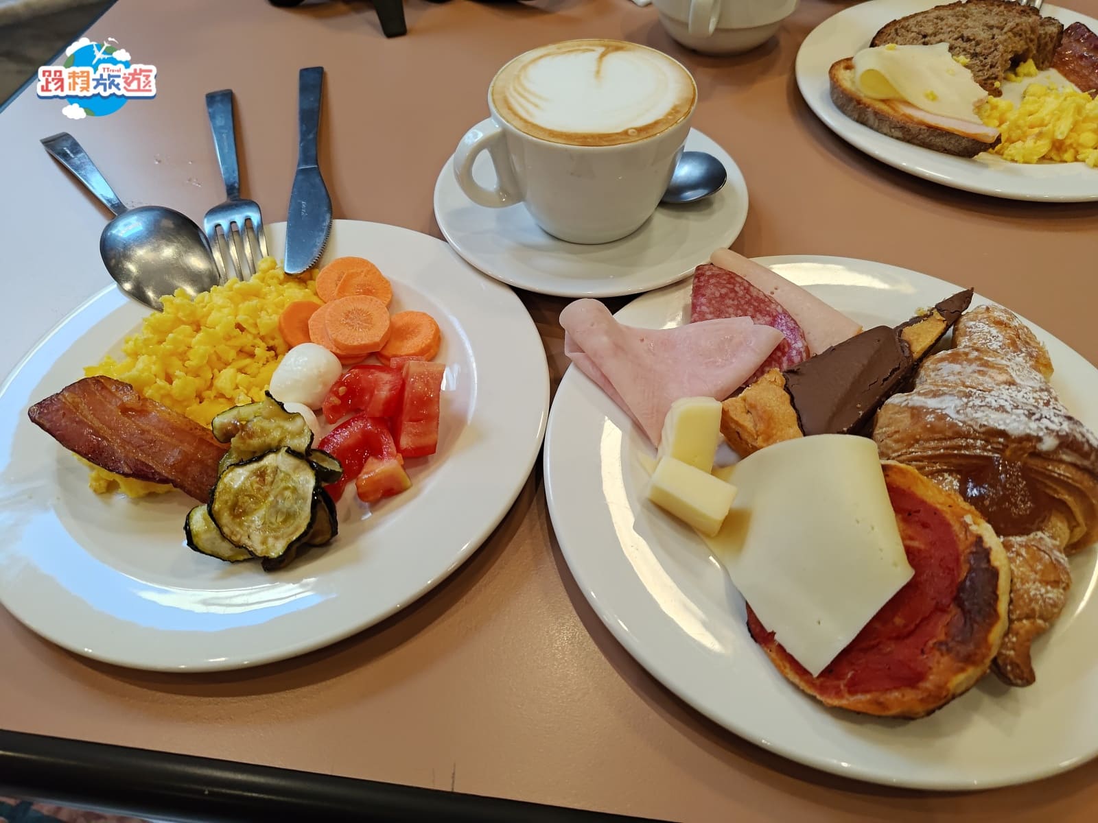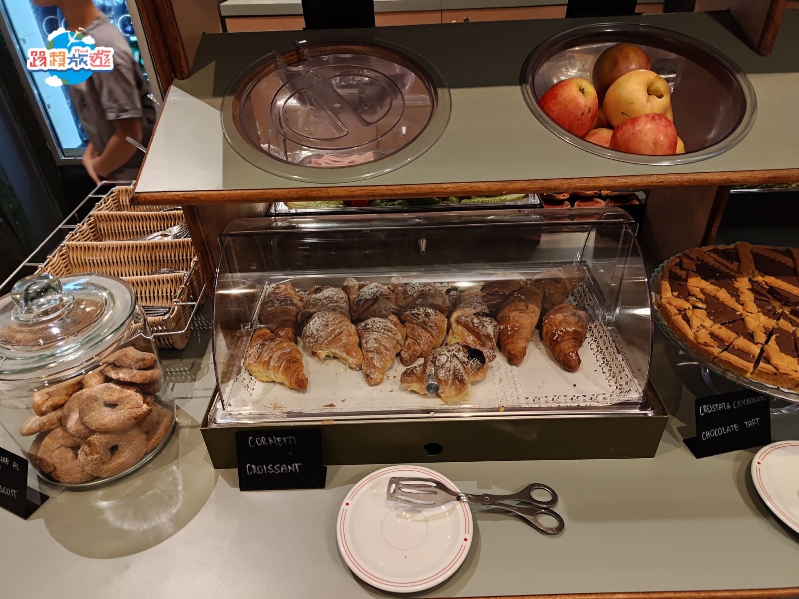 沿著中島繞一圈會先看到可頌、巧克力派和水果,另外麵包類、派的口味每天都不同,如果連續住幾天不用擔心一直吃到重複的口味,這點滿貼心的每天都會給房客不同的驚喜