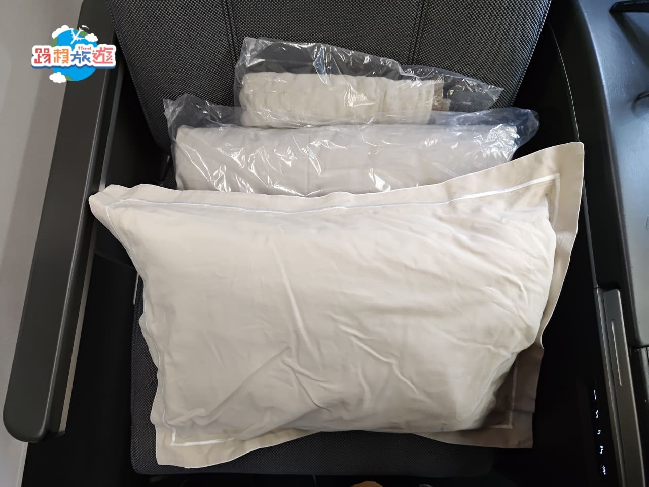 因為我們是晚上12點的飛機,一上機就會先提供枕頭、棉被和床罩,方便起飛後吃完晚餐就能就寢