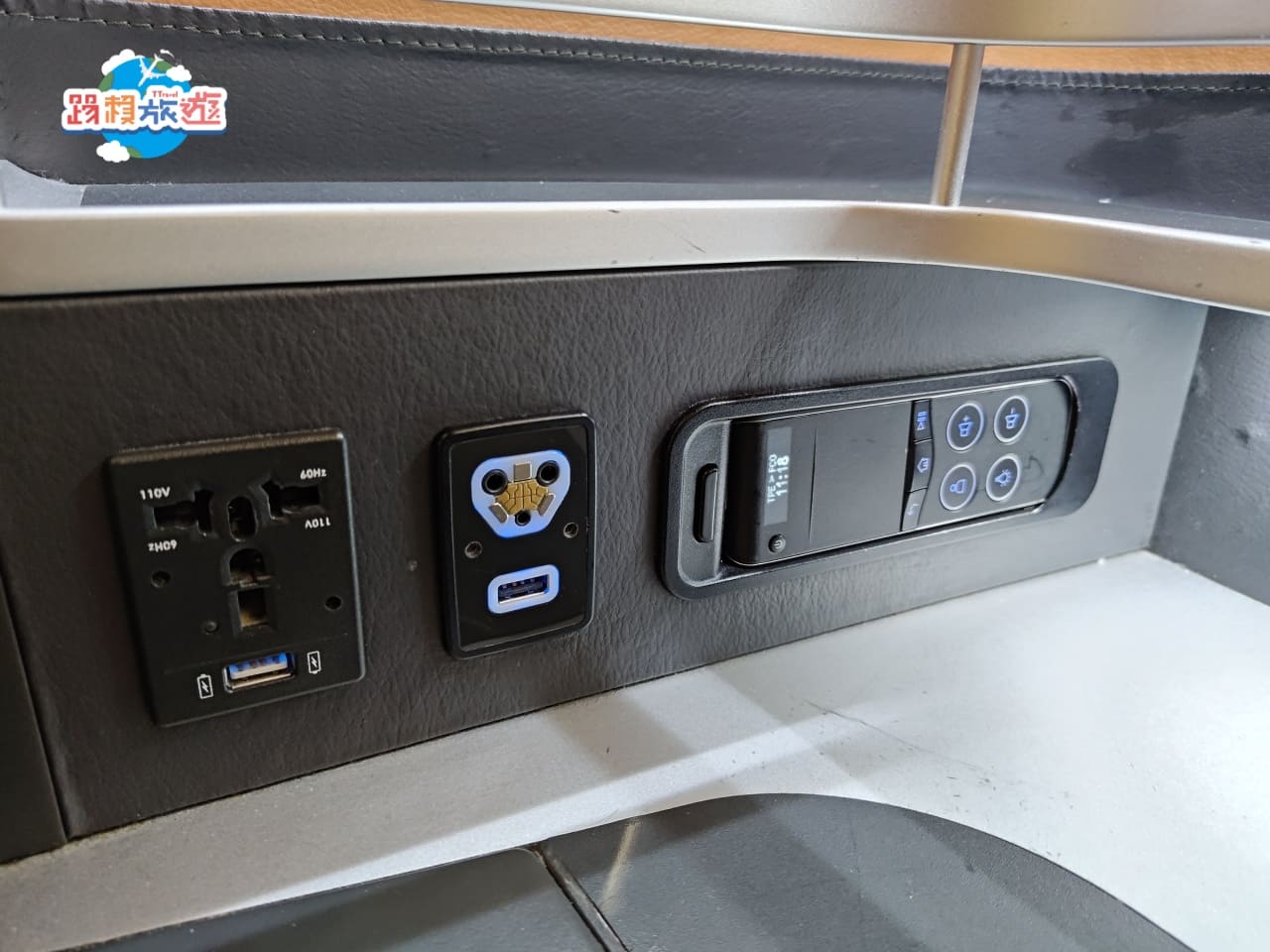 架子的下方有萬國插座、USB 充電孔,長途飛行不怕電子產品會用到沒電,不過功率比較弱所以充電時間會比平常久一點。最裡面是遙控器,不過基本上在商務艙不管的電視螢幕觸碰反應快,座椅設定的按鈕多,我個人是幾乎沒有在使用這個遙控器啦~