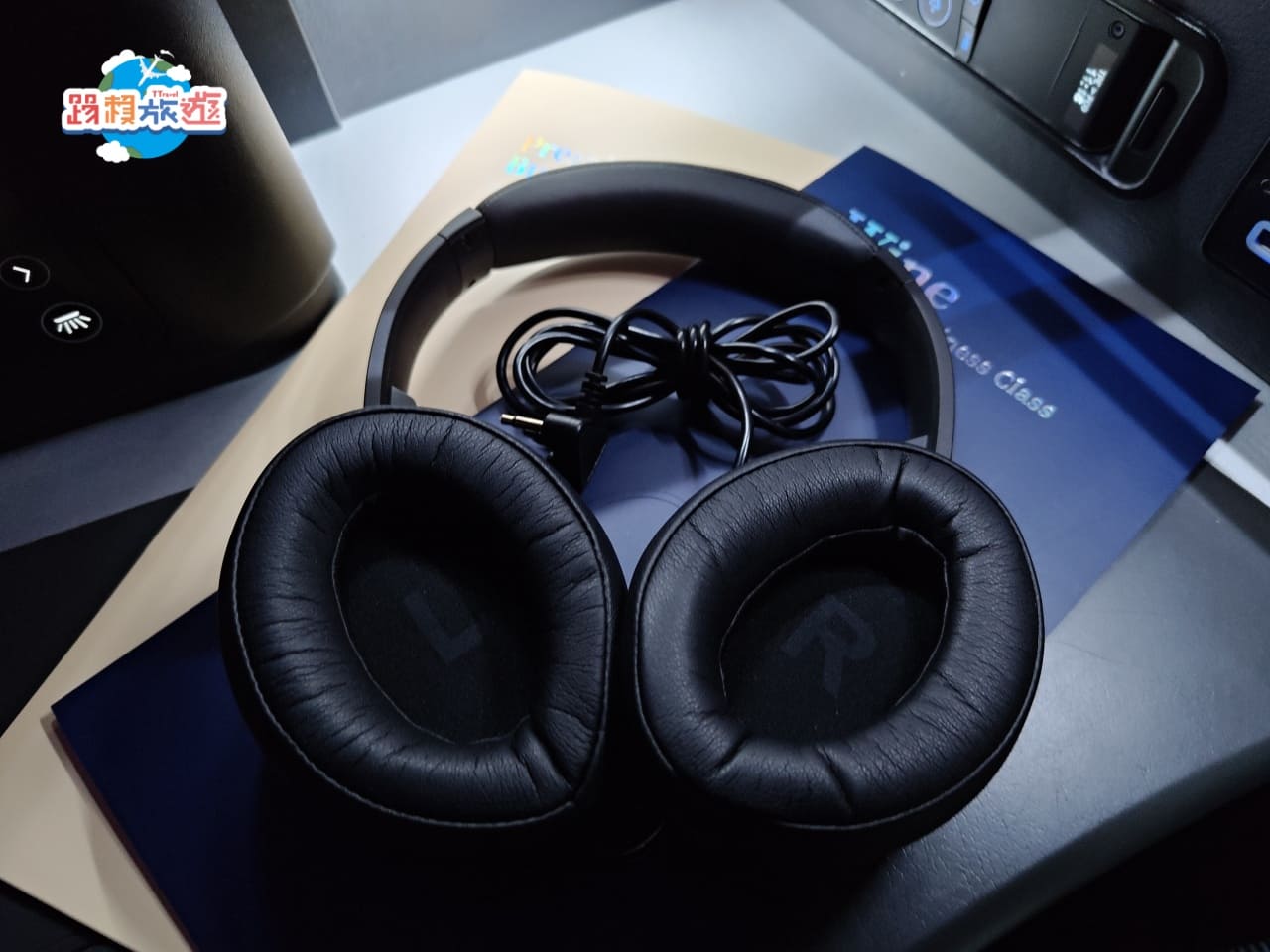 另外有附拖鞋和耳罩式耳機,拖鞋穿起來滿柔軟的不用讓雙腳一直悶在鞋子裡面
