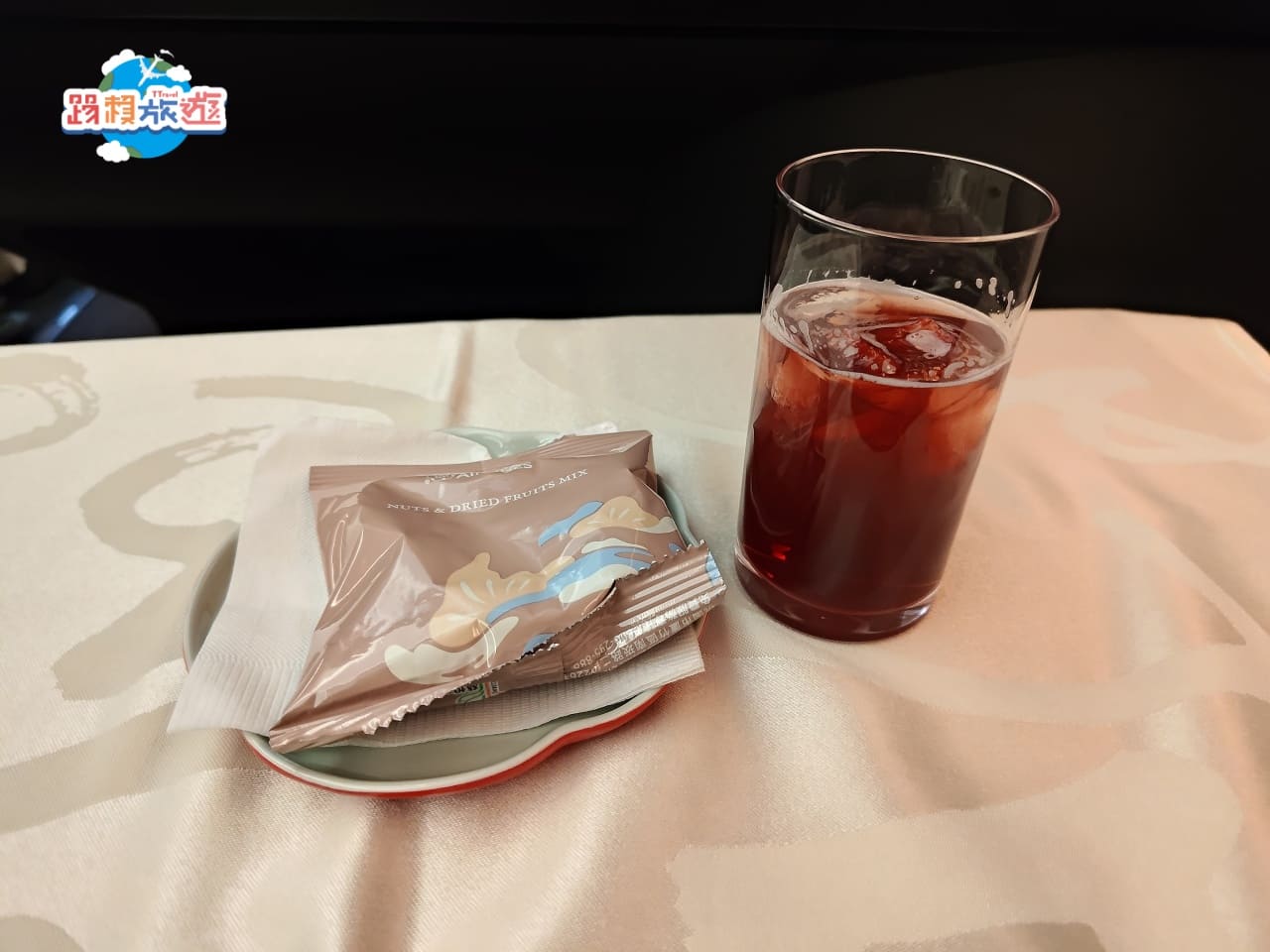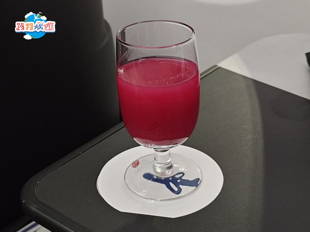 飲品我點的是「紫雲漫旅」,這是跟「金色三麥」聯名的調酒,菜單上共有兩種可以選,這個是空服員推薦的就點來喝喝看,味道滿香的口感溫柔滑順,尾韻才會感受到淡淡的酒精味,是一款非常溫和的調酒