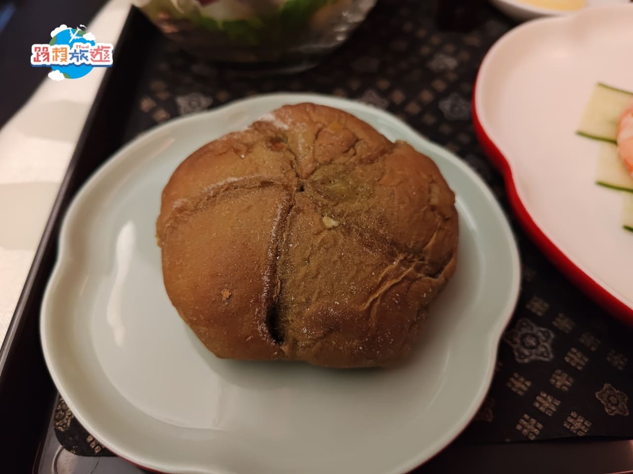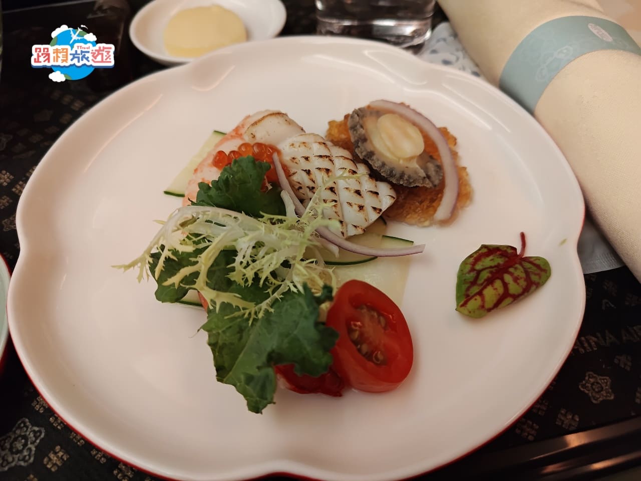開胃菜是「海鮮綜合拼盤」,沙拉是「杏鮑菇核桃季節沙拉」,再搭配一個「茉莉綠茶香橘麵包」