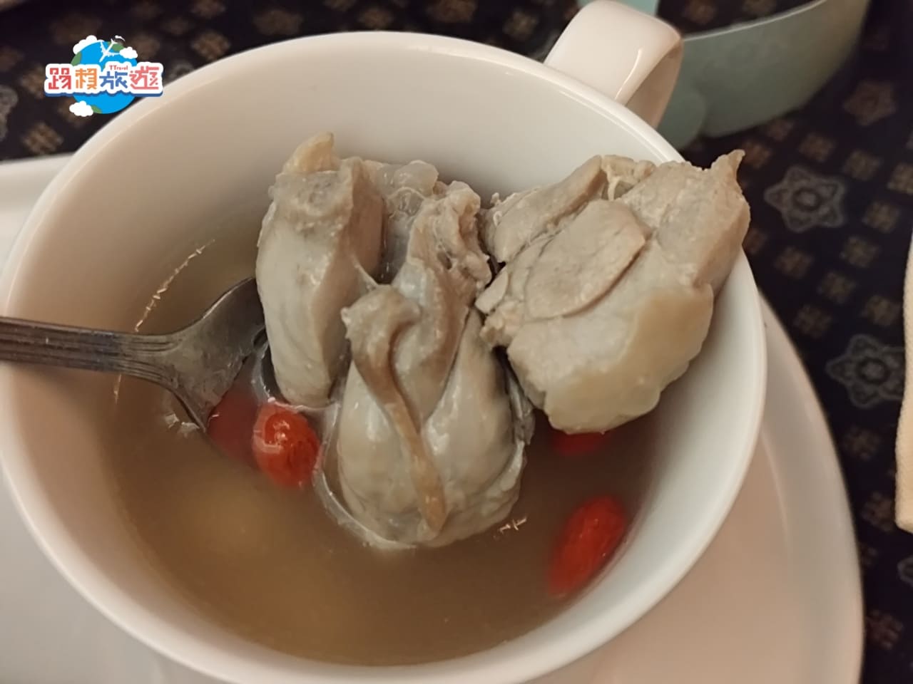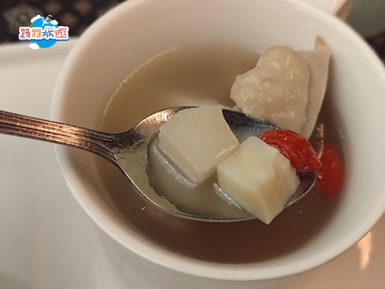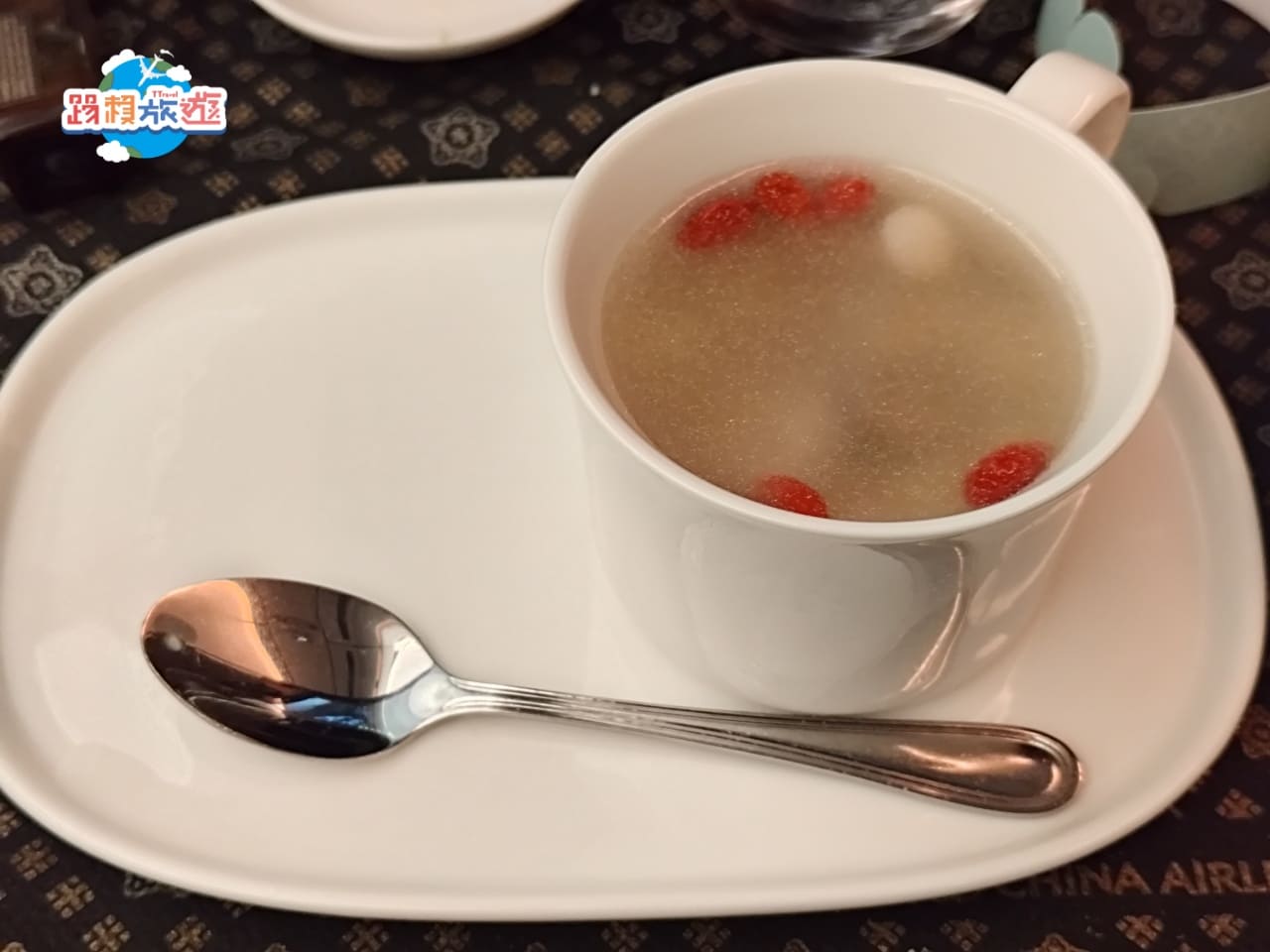 湯品提供的是「香菇竹筍雞湯」,上面還有枸杞看起來非常養身