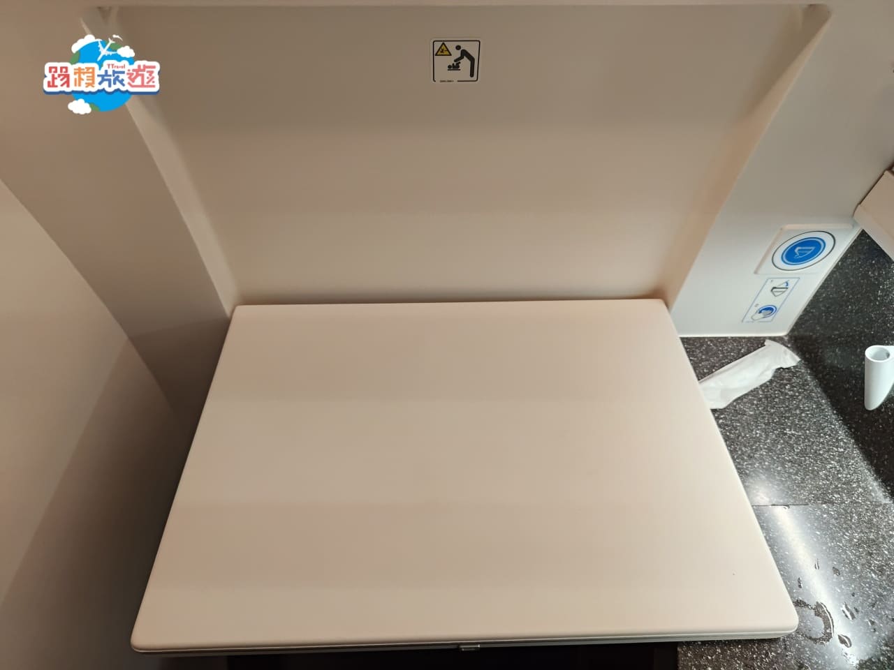 馬桶上方的板子打開是嬰兒換尿布的平台,空間滿大的也穩固