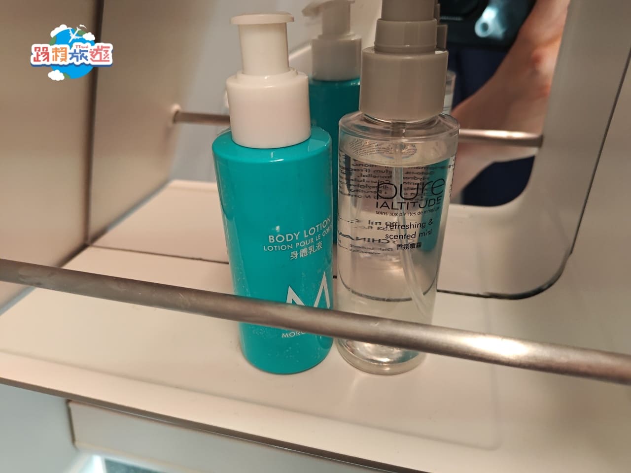 架子上有乳液和香氛噴霧可以使用,畢竟長時間搭飛機空氣比較乾燥,適合擦點乳液皮免皮膚乾裂