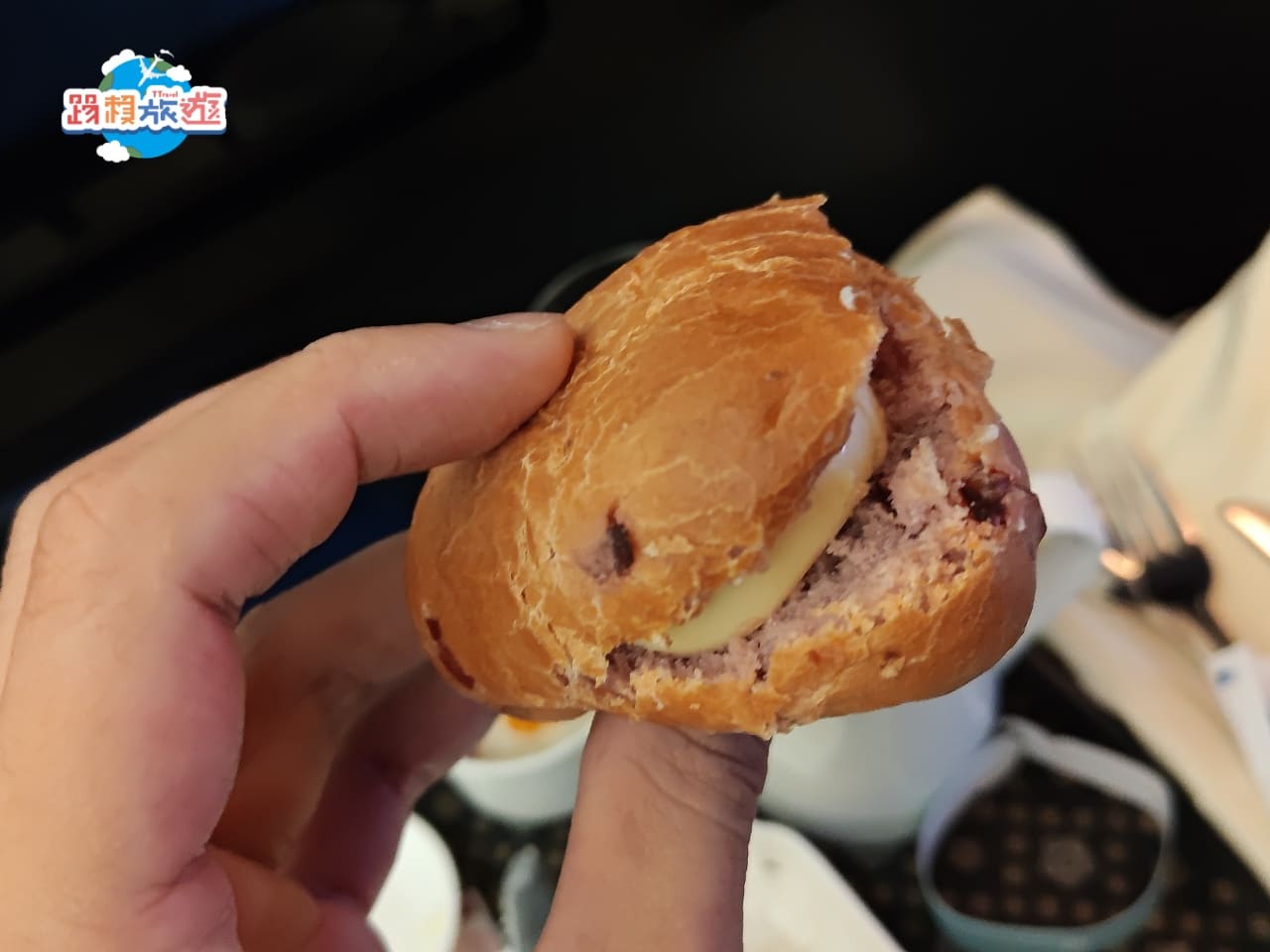 麵包有「紫薯蔓越莓麵包」,中間加入奶油吃起來的口感比較滑順不會太乾,咀嚼中蔓越莓的香氣會慢慢釋放出來,另一個是「帕瑪森軟法」吃起來的口感蓬鬆,直接吃會有麵包獨特的香氣