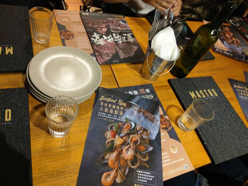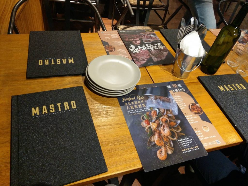 桌子除了木色的桌面外,還放置著黑色的菜單