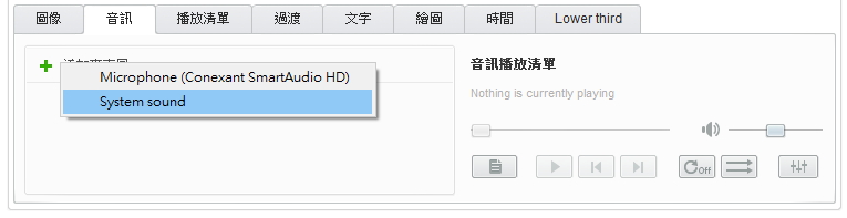 2016.11.04 ManyCam錄影沒聲音 網路資訊 Tweet 用ManyCam錄影發現影片聲音錄不進去時 先點選底下的”音訊” 選”添加麥克風” 再選”System sound” 這樣就可以錄到影片的聲音囉~ 還有~ManyCam錄影時有用麥克風也會直接將麥克風的聲音錄進去 如果怕錄到雜音只想要有錄的影片的聲音 將麥克風拔掉就可以了 相關