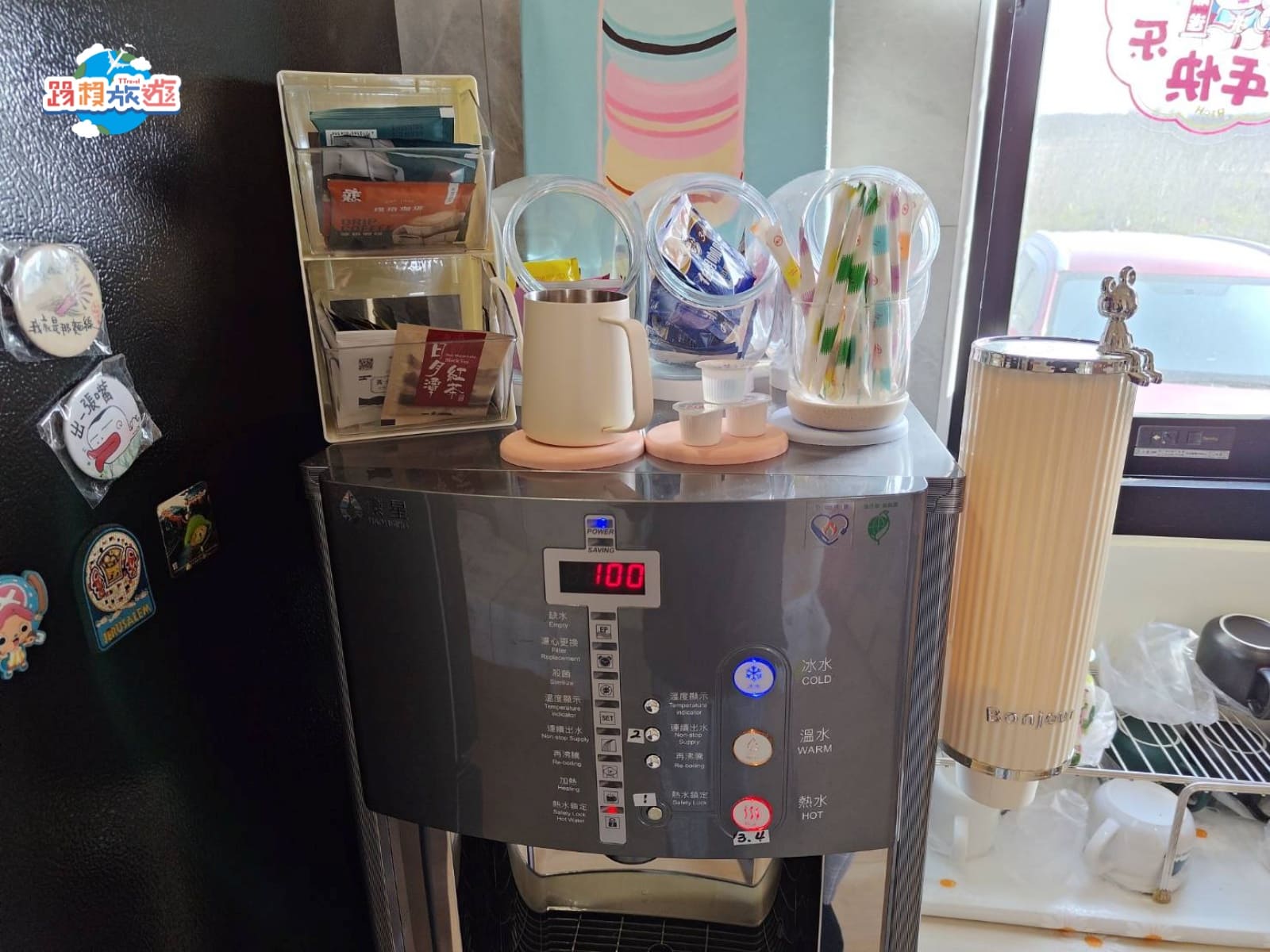 飲水機上有咖啡和各式茶包,雖然是沒有提供早餐,但是早晨的飲品一樣是可以自己手沖一杯