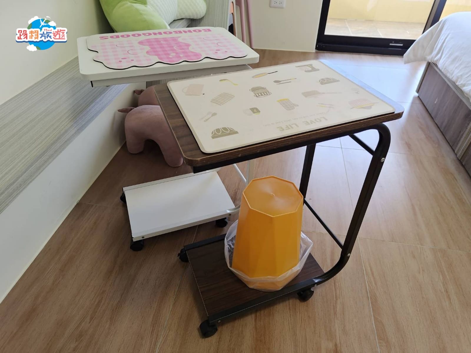 電視前面有兩張懶人桌,可以拉到床邊放食物在上面,邊追具邊吃零食