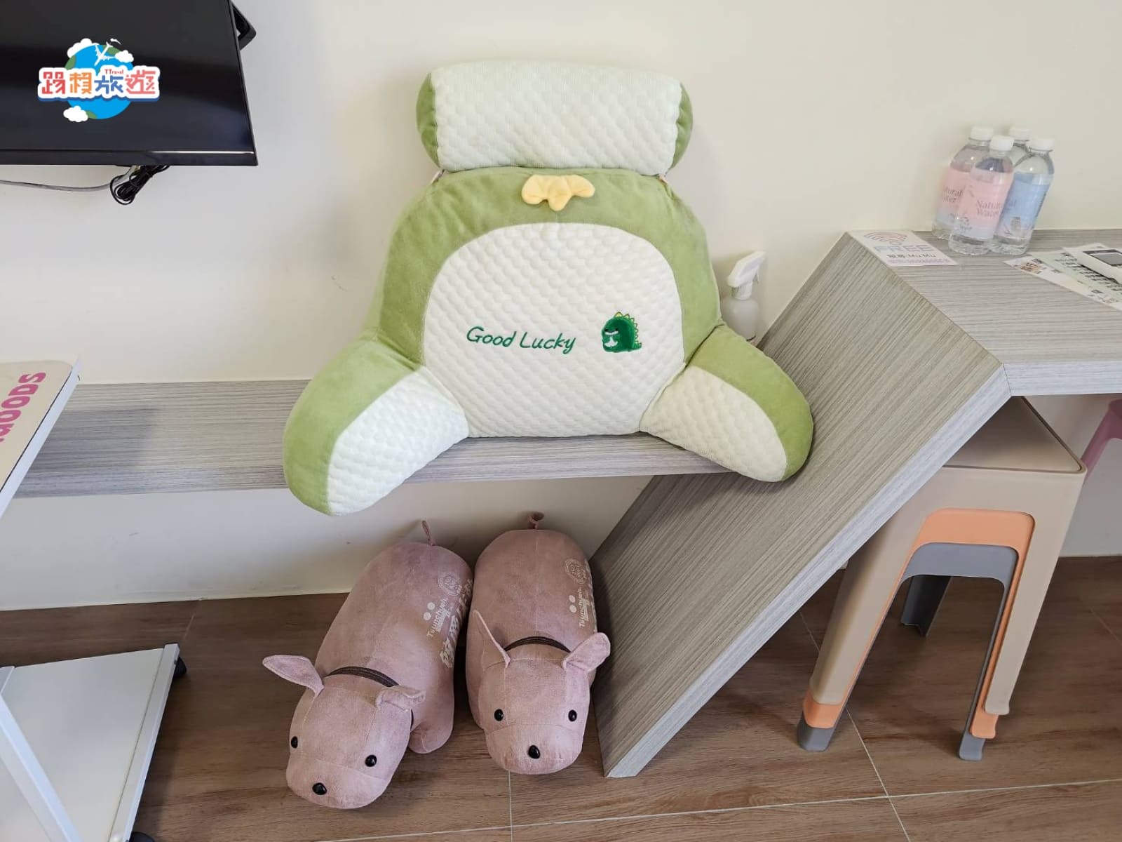 如果想要坐在床上又擔心靠著牆太硬或是枕頭支撐度不夠,電視旁邊還有一個超大抱枕,放在背後靠著那叫一個舒服啊~