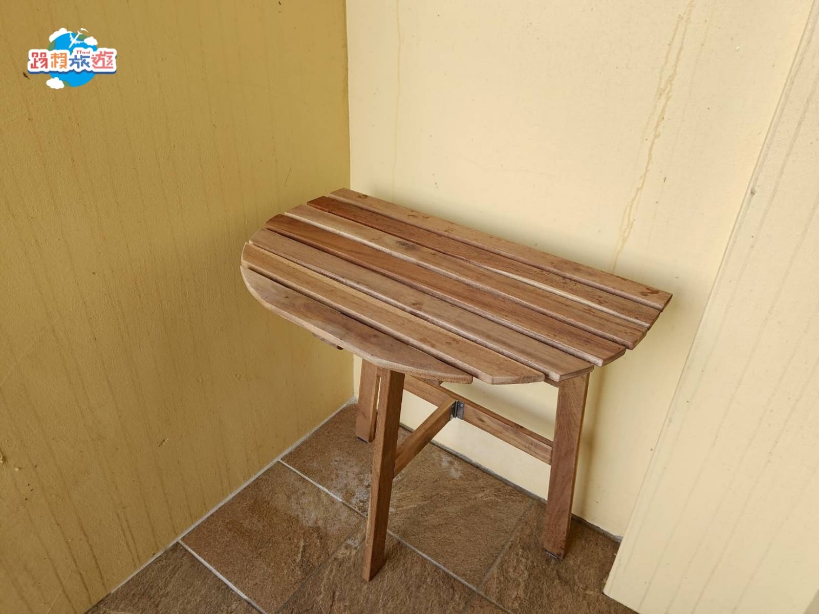 旁邊有一張木桌,房間的桌子下有小椅子可以拿出來使用,可以坐在陽台邊聊天邊喝飲料吃零嘴,好好享受澎湖愜意的時光