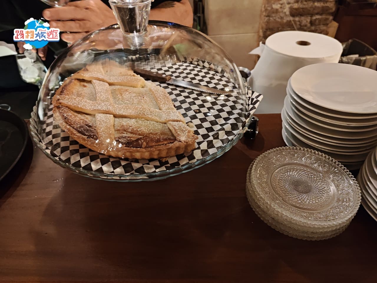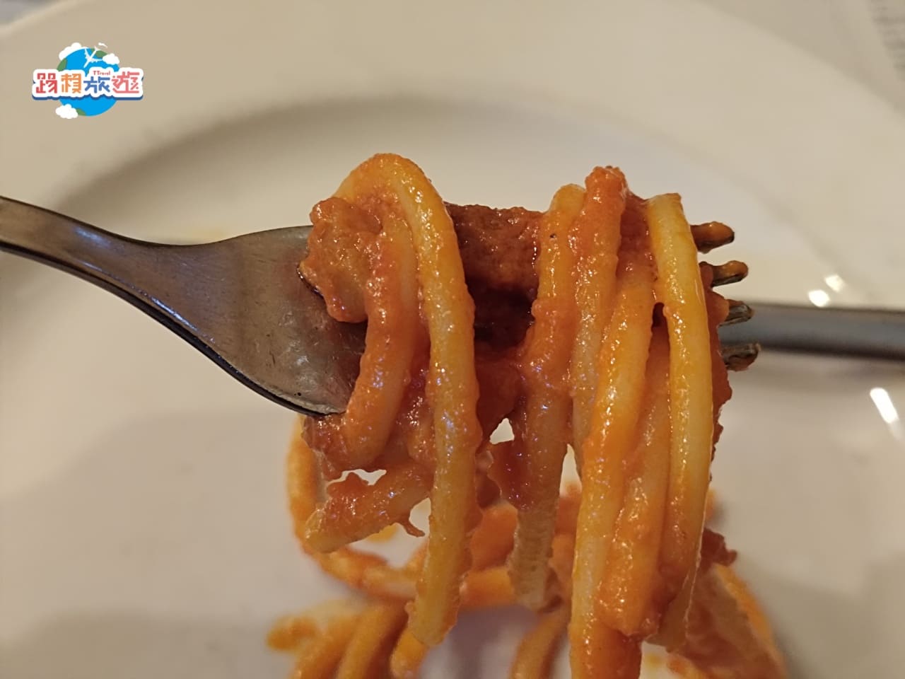 這道義大利麵跟以往在台灣吃的不太一樣,是將煮好的Bucatini (一種中間有孔的粗麵) 倒入起司輪中,加入阿馬特里恰納醬,再淋上烈酒點燃火焰,讓麵條在起司與醬汁的融合中吸收風味,只可惜我們沒有看到現場的火焰秀可能是因為人真的太多