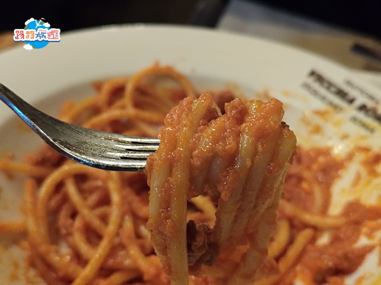 品嚐一口麵條的口感非常彈牙,醬汁濃郁且鹹香夠味,帶著番茄的微酸與義式培根 (Guanciale) 的獨特鹹香,還有佩克里諾起司 (Pecorino cheese) 的濃郁奶味,交織出豐富的層次感。