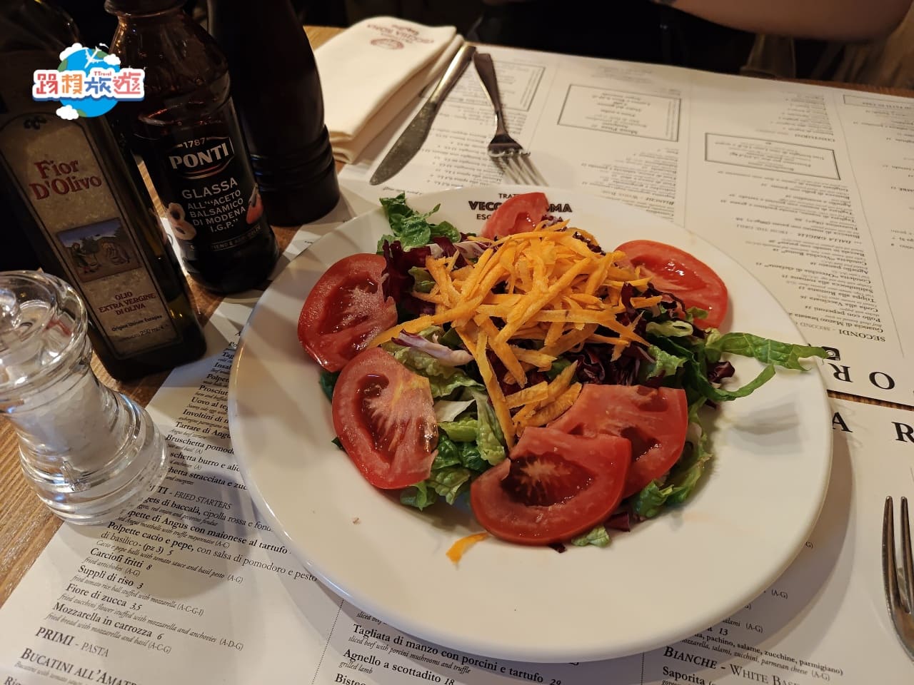 綜合生菜沙拉選用了新鮮翠綠的生菜和飽滿多汁的番茄,上桌好可以自行淋上橄欖油和醋,再撒上少許鹽。