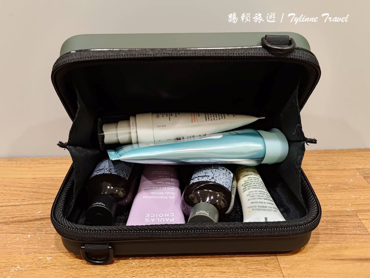 也可以當作「盥洗包」或「化妝包」使用,體積的大小跟航空公司提供的長程過夜包有點像,裡面可以放入各種梳洗用品或化妝品,外殼堅固不用擔心因為撞擊導致裡面的瓶瓶罐罐破裂