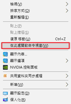 在桌面空白的地方按「Shift」+「右鍵」,點選「在此處開啟命令視窗」也就是cmd